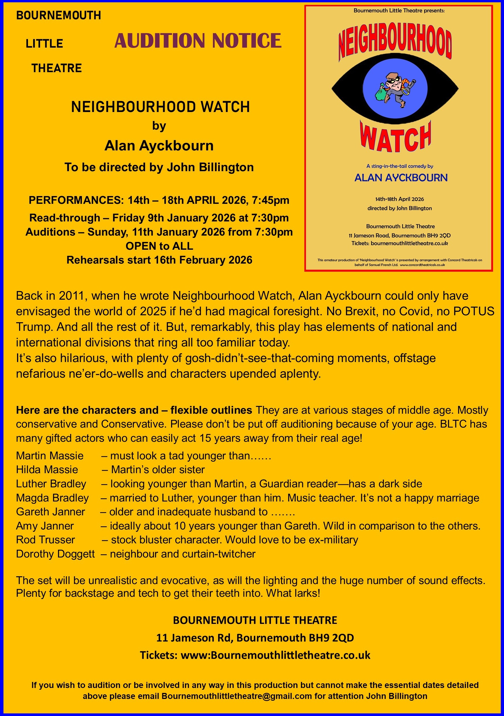 Auditions for "NEIGHBOURHOOD WATCH" by Alan Ayckbourn (click HERE for audition notice, which provides more details)